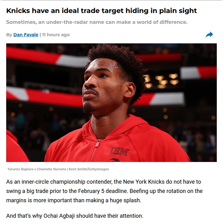summersivan+FollowKnicks’ bench could get a game-changing boostThe Knicks’ biggest need right now isn’t a superstar—it’s a reliable wing off the bench, and Ochai Agbaji might be the perfect fit. He’s flying under the radar in Toronto, but his defense is elite, often taking on the toughest assignments. With Josh Hart now starting, the Knicks’ bench is thin on wings, and Agbaji could fill that gap immediately. The best part? He’s likely available for just second-round picks and salary matching. If New York can pull this off, it could be a low-risk, high-reward move that pays off big in the playoffs. What do you think—should the Knicks go for it? #Sports #Basketball #Knicks30Share