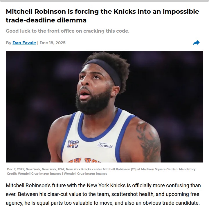 Susan Reeves+FollowKnicks face tough call on Mitchell RobinsonMitchell Robinson’s situation is putting the Knicks in a real bind as the trade deadline approaches. He’s absolutely crucial for New York’s defense and rebounding, but his injury history and looming free agency make things complicated. If the Knicks want to bring in a big name or add depth, Robinson’s $13 million salary might have to be part of the deal. But can they really afford to lose him with a playoff push on the line? The front office has to weigh his unique value against the risk of losing him for nothing this summer. What would you do if you were in charge? #Sports #Basketball #Knicks00Share