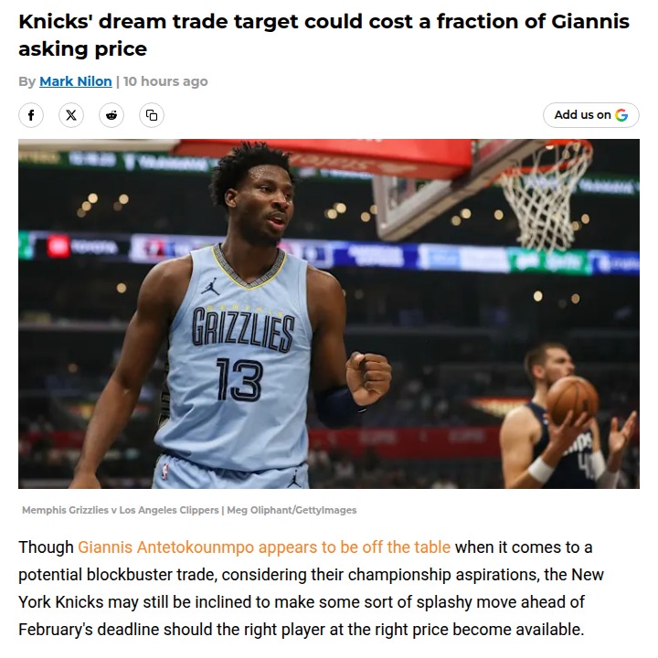 Susan Reeves+FollowKnicks Eye JJJ: The Real Trade Splash?With King Giannis off the market, Knicks fans, could Jaren Jackson Jr. be the real game-changer we need? League insiders are buzzing that JJJ might be the next big name available, and the price tag is way lighter than a Giannis deal. His elite defense and floor spacing could be the missing piece next to KAT. Would you pull the trigger if it means moving on from Towns? Let’s hear your takes! #Sports #Basketball #Knicks00Share