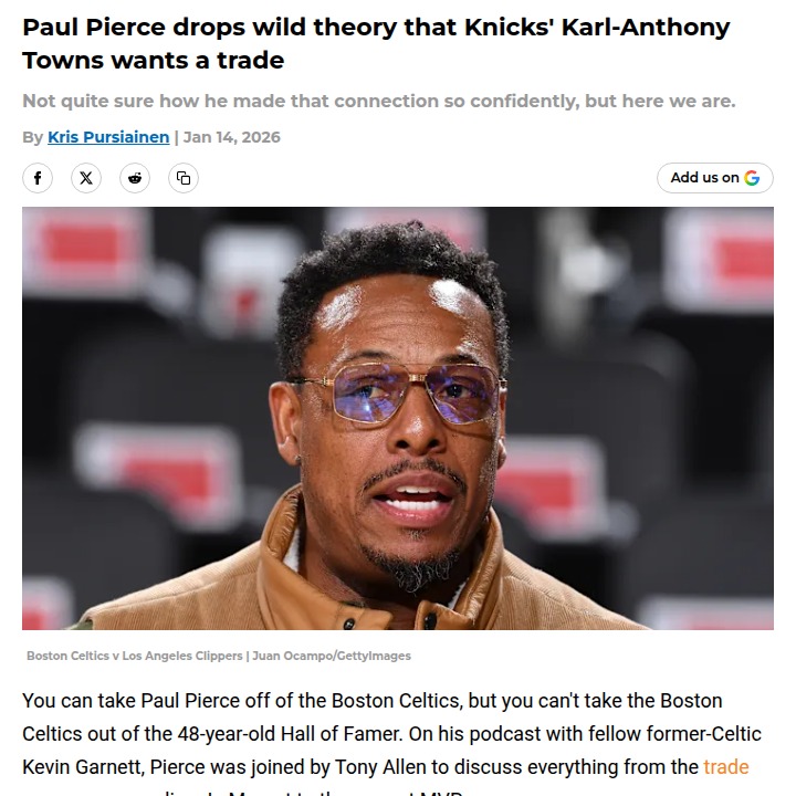 Brian Gaines+FollowDid KAT Just Hint at a Knicks Exit?So, The Truth is stirring the pot again! Paul Pierce claims Karl-Anthony Towns' lackluster 6-point night against the Pistons means KAT wants out of New York. Pierce says the big man looked totally disengaged and unhappy with the Knicks' offense. But KG, who knows Towns well, isn’t buying it—he credits Detroit’s hunger instead. Do you think KAT’s ready to ask for a trade, or is Pierce just reading too much into one rough game? #Sports #Basketball #Knicks10Share