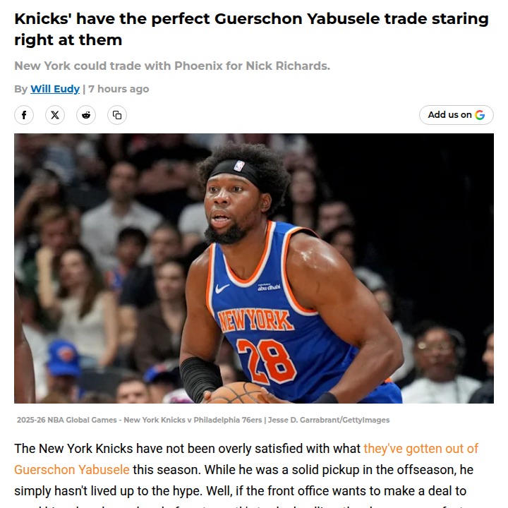 Oscar Gonzalez+FollowKnicks vs Suns: Yabusele for Richards?Fellow Knicks fans, what do you think about a potential swap—Yabusele for Nick Richards? Yabu just hasn’t found his groove in New York, and with the front office looking to beef up the frontcourt behind KAT and Mitch, Richards could be the perfect fit. He’s a solid rebounder and rim protector, and with Phoenix barely using him, this deal feels like a win-win. Would you pull the trigger or hold out for more? #Sports #Basketball #Knicks00Share