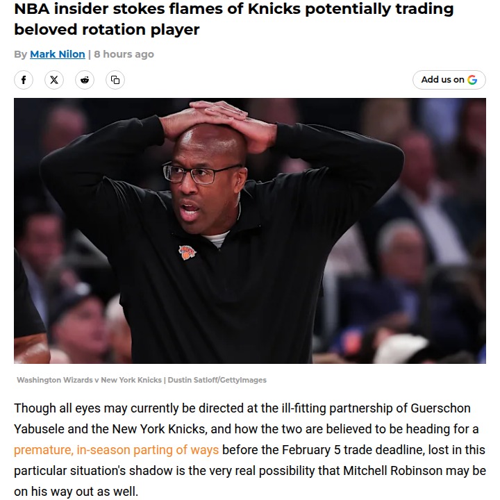 Oscar Gonzalez+FollowKnicks fans brace for possible Mitchell Robinson tradeMitchell Robinson’s future with the Knicks is suddenly up in the air, and it could mean big changes for New York’s playoff push. With the trade deadline approaching, insiders say the front office might move Robinson—one of the league’s top rim protectors and rebounders—to avoid losing him for nothing in free agency. While the focus has been on Guerschon Yabusele’s likely exit, Robinson’s potential departure would shake up the rotation and could bring in a major upgrade. How would you feel about the Knicks trading away such a key piece? #Sports #Basketball #Knicks01Share