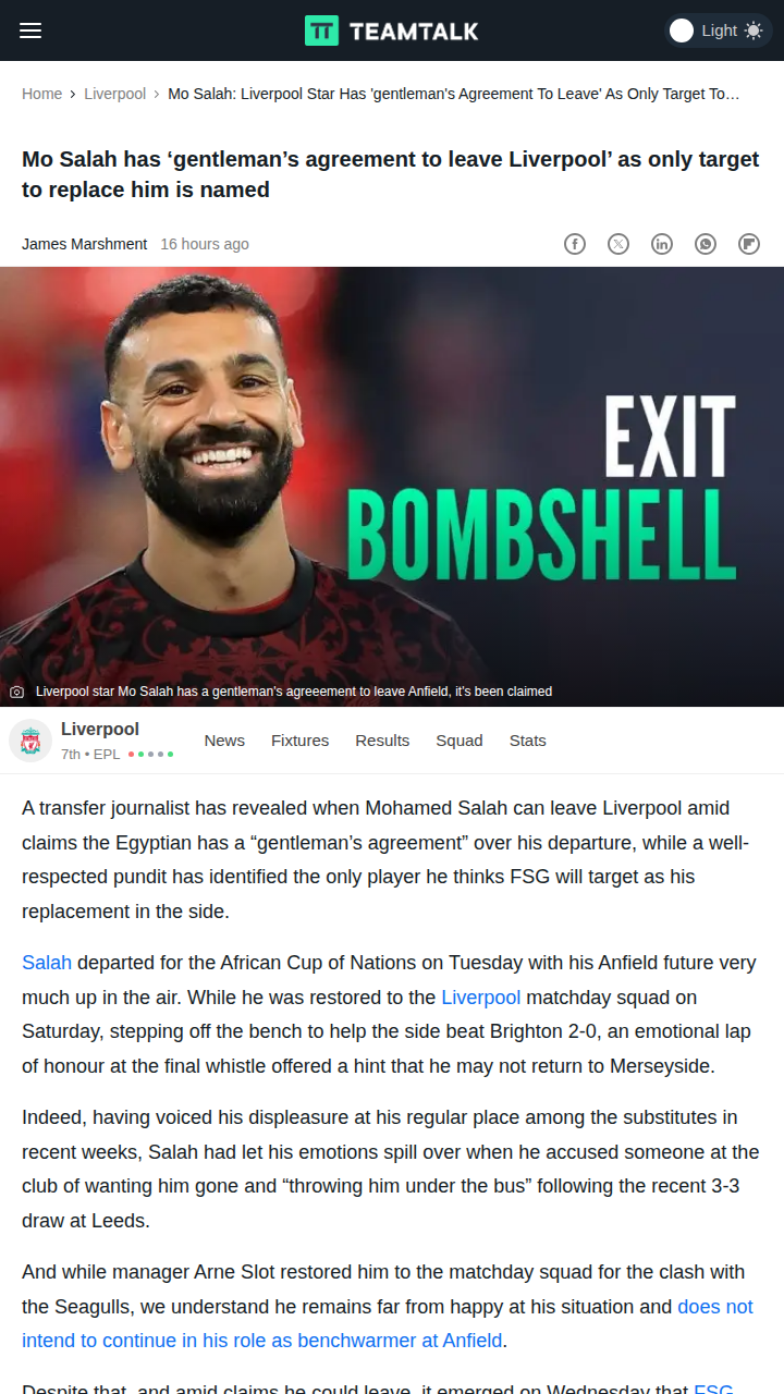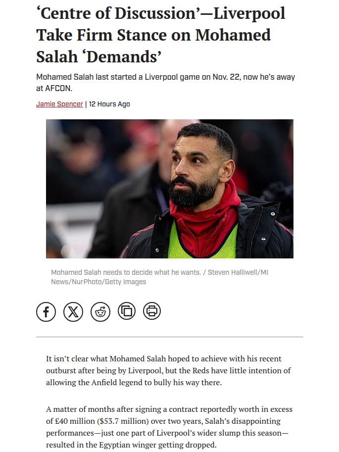 Allison Travis+FollowMo Salah’s Anfield Future: Saudi Only?Big news for Reds fans: Liverpool’s top brass are putting their foot down—King Mo isn’t leaving Anfield this January, no matter the Saudi millions. Despite a heated spat with Slot and that emotional lap of honour, FSG want Salah to see out his contract. Still, if the Egyptian King does push for an exit, two sources say it’s Saudi Arabia or nowhere. Is this the start of a new transfer saga or just smoke? #Sports #Soccer #LFC00Share