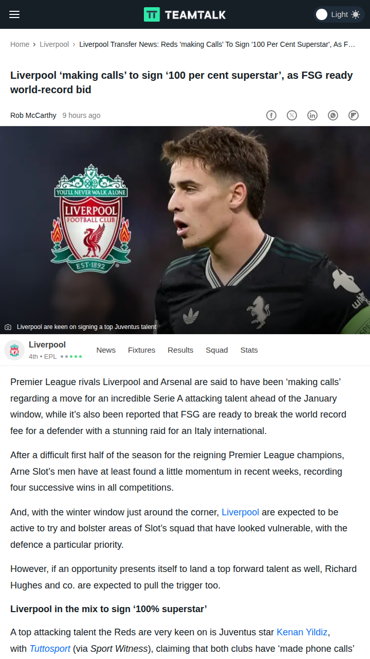 rogerschristine+FollowReds Eye Yildiz as Juve Sweats Transfer CallsBig news on the transfer front: Liverpool and Arsenal are both dialing up Juventus about Kenan Yildiz, the 20-year-old Turkish sensation dubbed a '100% superstar.' With the Reds’ defense needing fresh legs and FSG reportedly ready to smash the world record for a defender (think Bastoni), this window could get wild. Juve’s scrambling to lock Yildiz down, but if the contract stalls, could we see him lighting up Anfield soon? #Sports #Soccer #LFC00Share