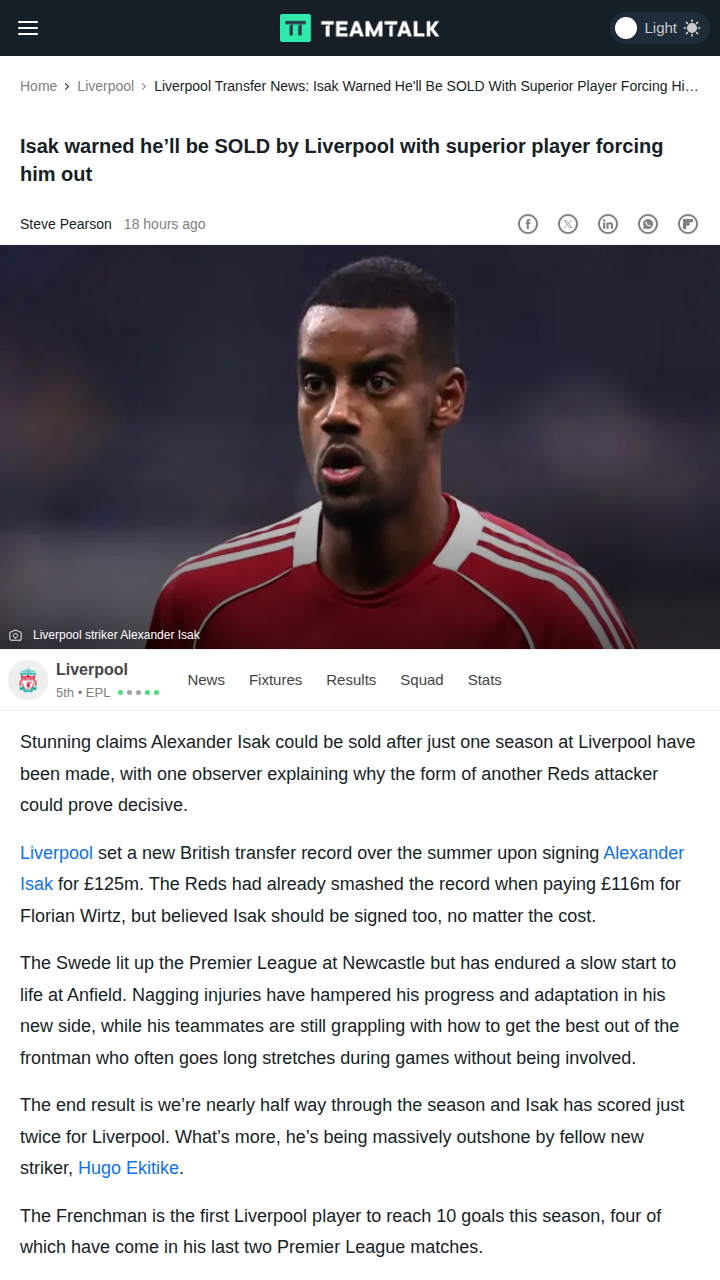 Jamie Mack+FollowIsak Injury Rocks Reds After Spurs ThrillerTough break for the Reds! After a dramatic 2-1 win over Spurs, Liverpool fans are sweating over Alexander Isak’s fitness. The $170M man scored the opener but went down hard after a challenge from van de Ven. Early word is he could be out for weeks, which is a massive blow just as he was finding his feet. Can Ekitike step up in his absence? #Sports #Soccer #LFC00Share