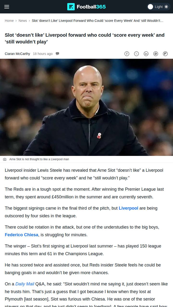 rogerschristine+FollowSlot’s Trust Issues with Chiesa Stir DebateReds fans, what’s the deal with Arne Slot and Chiesa? Even after Chiesa—Slot’s first signing—keeps finding the net off the bench, he can’t get a start in the league. Insiders say Slot just doesn’t trust him, especially after that Plymouth loss. With the attack misfiring and even King Mo getting dropped, is it time to give Chiesa a real shot? Or is there more to this story? #Sports #Soccer #LFC30Share