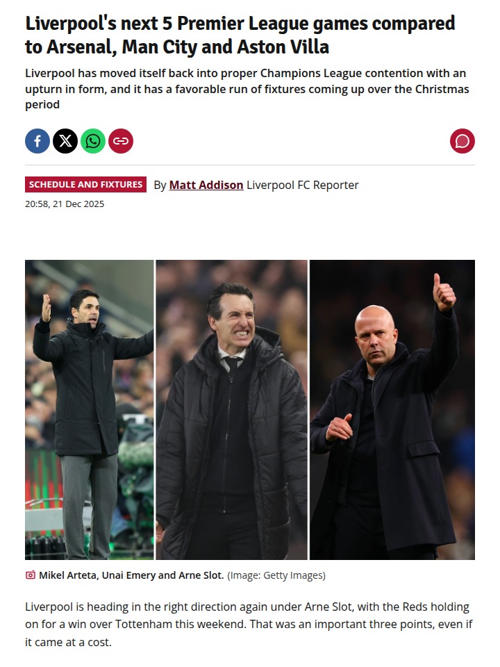 Jillian Morse+FollowReds’ Festive Run: Can They Outpace Arsenal?Big win for the Reds over Spurs, but it came at a price—Isak could be sidelined and Conor Bradley limped off. With Arne Slot steering Liverpool back into the Champions League spots, the next five games look promising except for that clash at the Emirates against Arsenal. The real question: can the Reds take advantage of a favorable run and close the gap on the Gunners and City? Let’s hear your predictions! #Sports #Soccer #LFC00Share