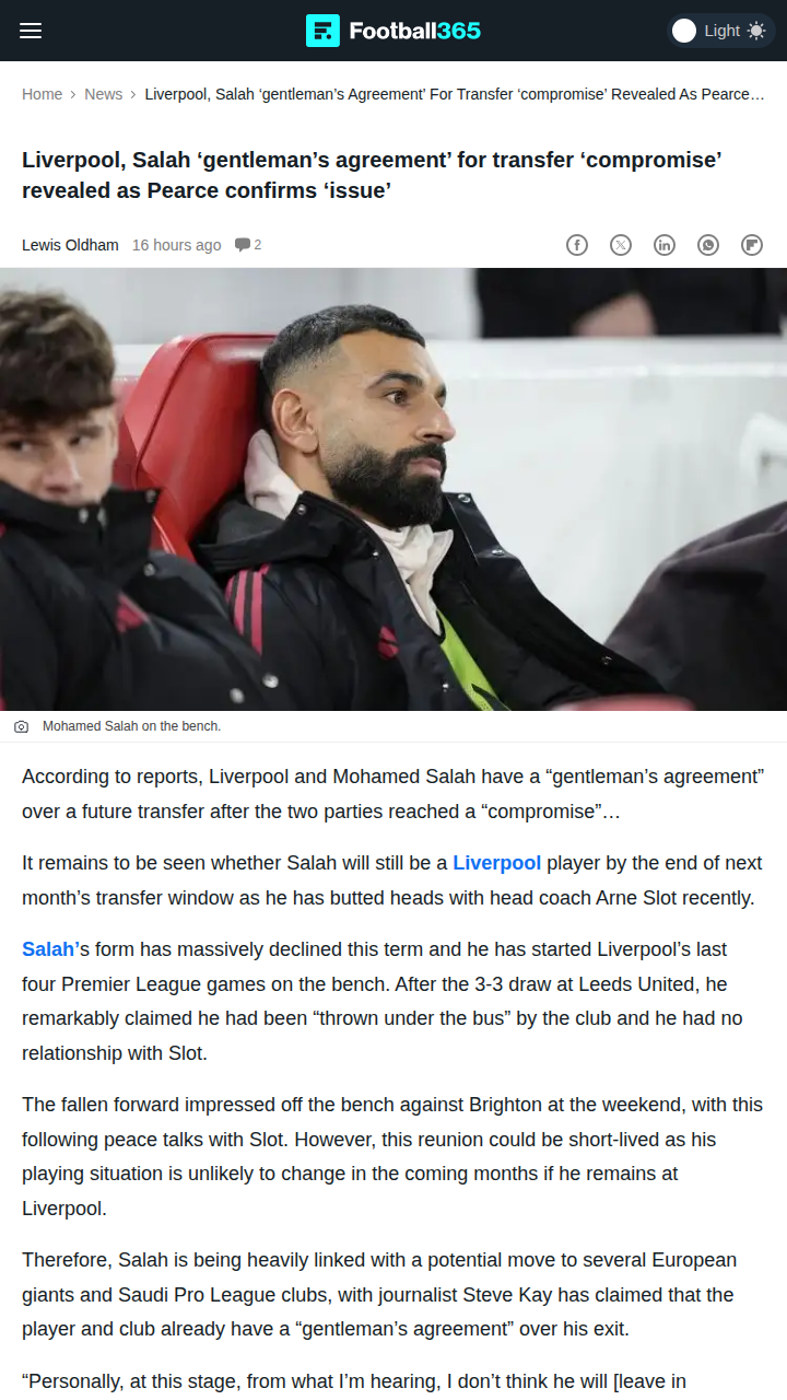 Allison Travis+FollowSalah-Liverpool Rift: End of an Era?Is this the last dance for the Egyptian King at Anfield? After weeks of tension with new boss Arne Slot, Mo Salah’s bench role and public comments have fueled rumors of a summer exit. Reports say there’s a ‘gentleman’s agreement’ for Salah to leave if the right offer comes. With AFCON wrapping up and big clubs circling, is the Salah-Liverpool partnership heading for a dramatic split? #Sports #Soccer #LFC00Share