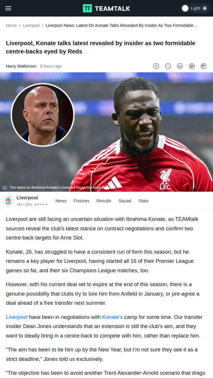 Tara Moran+FollowKonate Contract Drama: Reds Eye Defensive DuoInsider buzz says Liverpool are still locked in talks with Ibou over a new deal, but there’s no hard deadline. The big worry? If Konate leaves, the Reds will need two new CBs, not just one. Guehi and Schlotterbeck are top of Arne Slot’s wish list, but the club’s priority is to keep Ibou and add depth, not start from scratch. Losing him mid-season could really shake up the backline. Thoughts on who should partner the Iceman if he stays? #Sports #Soccer #LFC00Share