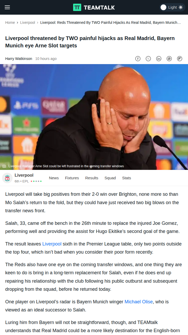 Malik Williams+FollowLiverpool’s Transfer Targets Under SiegeReds fans, what do you make of this? After a solid 2-0 win and Mo Salah (aka the Egyptian King) back in action, Liverpool’s transfer plans have hit a snag. Both Real Madrid and Bayern are circling Arne Slot’s top targets—especially Michael Olise, seen as Salah’s long-term heir. Meanwhile, Schlotterbeck seems to prefer Bayern over Anfield. Could this be a transfer window to forget, or will the Reds pull off a surprise? #Sports #Soccer #LFC00Share