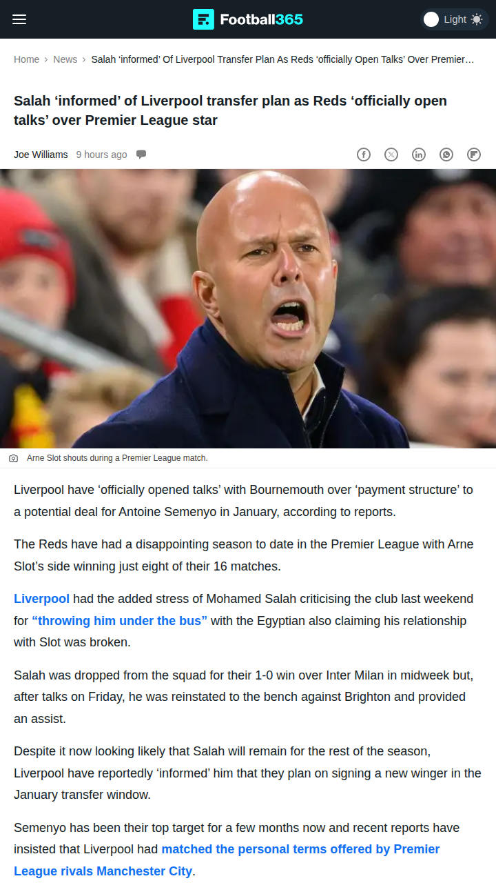 Maurice Miller+FollowSalah’s Future & Semenyo Talks: Reds’ Next Move?Big news for the Anfield faithful: Liverpool have officially started talks with Bournemouth over a payment structure for Antoine Semenyo, aiming to add depth out wide. After King Mo’s public fallout with Slot, it’s clear the club wants options, but Salah’s staying put for now. With City sniffing around too, could this be the next big Premier League rivalry in the making? Thoughts on Semenyo as a Salah backup or even future starter? #Sports #Soccer #LFC00Share