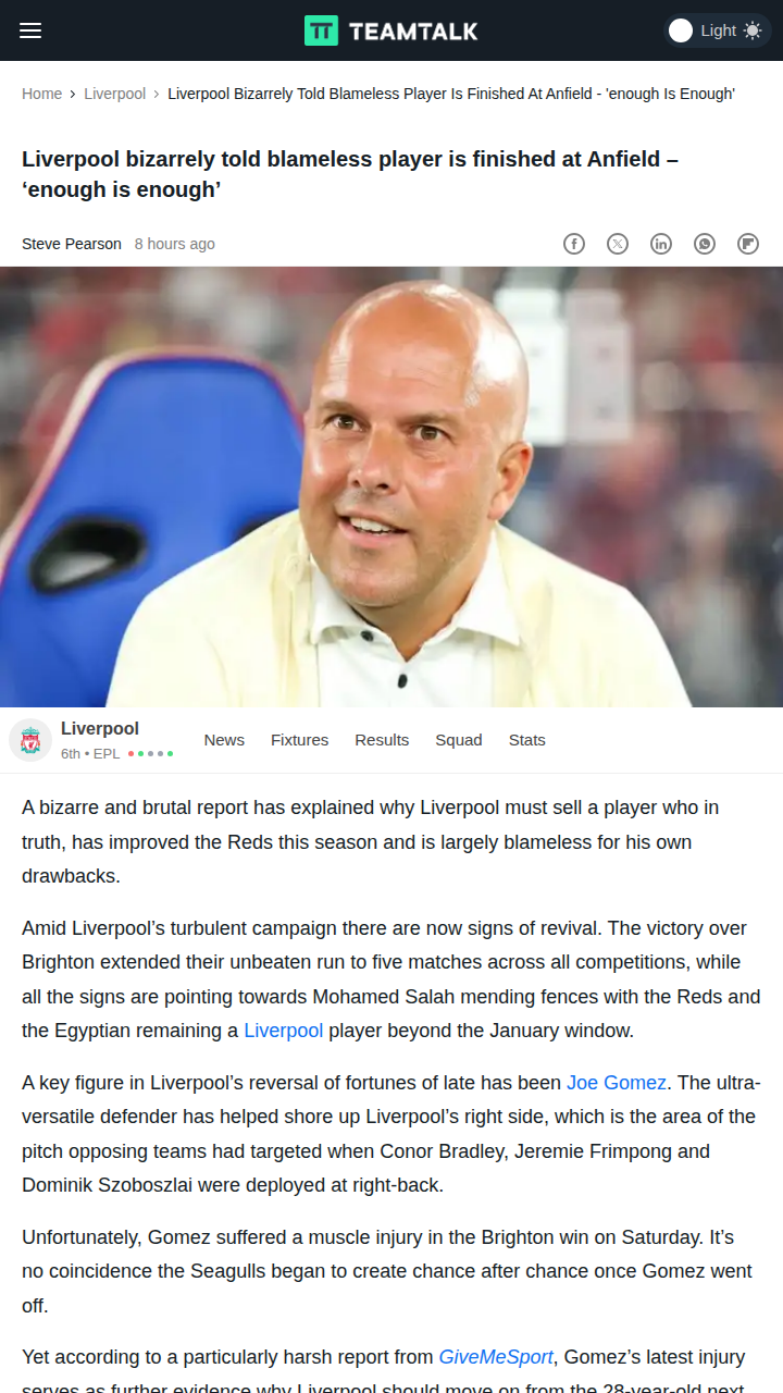 Malik Williams+FollowIs It Time for Liverpool to Move On from Gomez?Reds fans, what do you make of the latest call to sell Joe Gomez? The ‘versatile vet’ has been a rock on Liverpool’s right, but another injury vs Brighton has critics saying enough is enough. Yet, when Gomez left the pitch, Brighton found their groove. Sure, his injury record is rough, but his flexibility across the backline is hard to replace. With King Mo staying and Konate’s future uncertain, is it really time to cash in on Gomez? Let’s hear your thoughts! #Sports #Soccer #LFC00Share