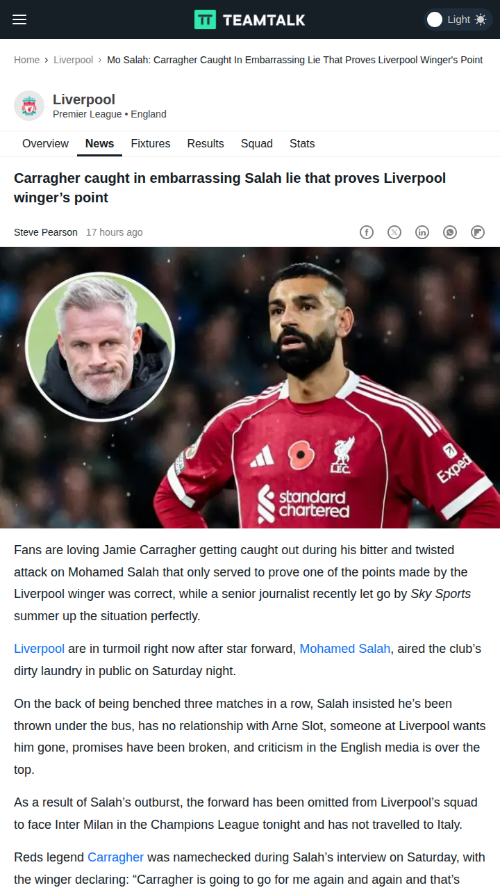Jamie Mack+FollowCarragher vs Salah: Media Meltdown at LiverpoolWow, what a week for the Reds! King Mo Salah’s explosive interview has Liverpool fans buzzing, especially after Jamie Carragher’s fiery response on MNF. Carragher called Salah a “disgrace,” but was hilariously caught in a lie about never criticizing Mo—proving Salah’s point about the English media’s harsh treatment. With Salah now left out of the Inter clash, is this the end of his Anfield story? The drama is real, and fans are taking sides. Thoughts on who’s right here? #Sports #Soccer #LFC00Share