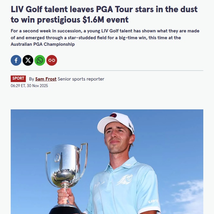 Michael Singh+FollowPuig’s Fireballs Outshine PGA Tour StarsDavid Puig, the Fireballs’ young gun and Sergio’s protégé, just made history Down Under! Puig became the first Spaniard since Seve to win the Aussie PGA, going bogey-free on Sunday and leaving big names like Adam Scott and Min Woo Lee in his wake. That’s back-to-back wins for LIV Golf’s rising stars. Is this the start of a new rivalry between LIV and the PGA Tour elite? Let’s hear your takes! #Sports #Golf #LIVGolf10Share