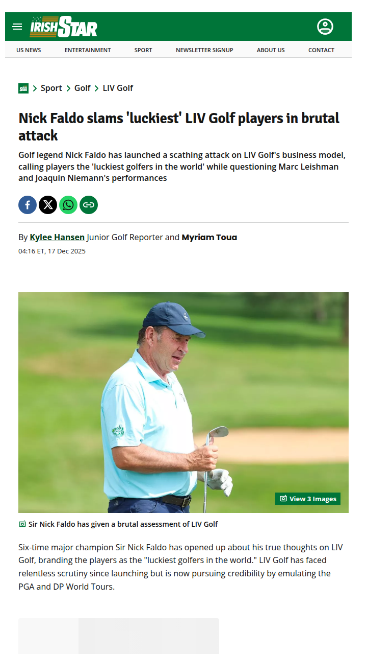 frank59+FollowAre LIV Golf Stars Just Lucky? Faldo Thinks SoSir Nick Faldo didn’t hold back on the NCG Golf Podcast, calling the LIV Golf crew the “luckiest golfers in the world.” With big names like DeChambeau and Koepka cashing in, Faldo argues that LIV’s format lets lesser-known and fading stars rake in millions. He even questioned the impact of their top earners, saying the business model is out of touch with reality. Is Faldo right, or is he just salty about the new era? Let’s hear your takes! #Sports #Golf #LIVGolf00Share