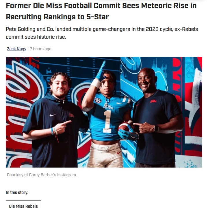 Jeffrey Armstrong+FollowCorey Barber's 5-Star Flip: LSU vs Ole MissWild turn in the SEC recruiting wars! Former Ole Miss commit Corey Barber, the Alabama wideout now ranked a 5-star, has followed Lane Kiffin to LSU. The Rebels thought they had a future star, but the Tigers swooped in after Kiffin’s move. This rivalry just got hotter—will Barber make Ole Miss regret it, or will the Rebels’ new WR crew shine? Let’s hear your takes! #Sports #Football #LSU00Share