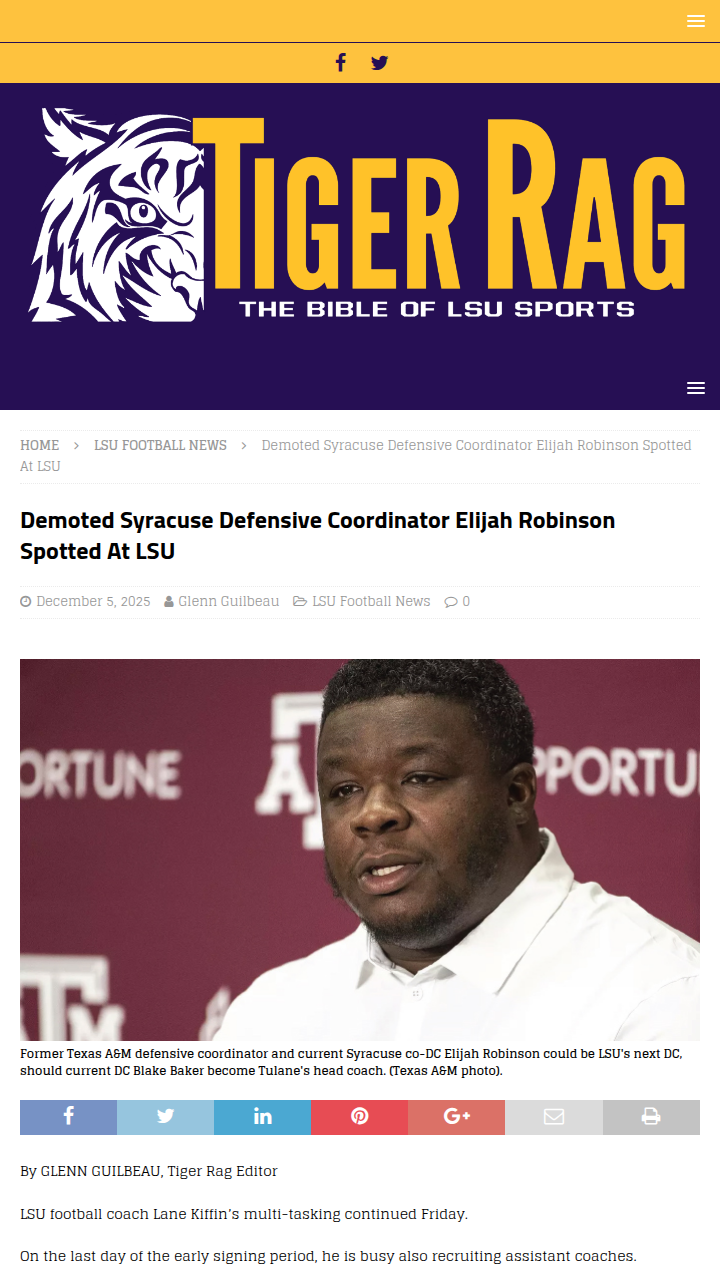 Amy Williams+FollowLSU Eyes Elijah Robinson Amid Coaching ShakeupLooks like Coach Kiffin is making moves again! Word is, Elijah Robinson—recently demoted at Syracuse—was spotted at LSU’s football ops. With the Mad Hatter possibly losing DC Blake Baker to Tulane, Robinson could be in line for a big role, but there’s a twist: LSU already has Tiger legend Kyle Williams coaching the D-line. If Baker bolts, will Robinson take over the defense, or is this just a depth move? The coaching carousel in Baton Rouge is spinning fast! #Sports #Football #LSUFootball00Share