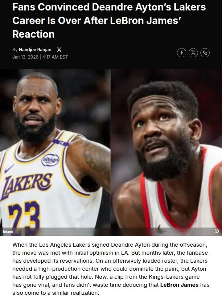 Susan Reeves+FollowLeBron’s look sparks Ayton trade rumors in LALeBron James’ intense sideline stare at Deandre Ayton has Lakers fans buzzing, with many convinced Ayton’s days in LA are numbered. The excitement that came with Ayton’s arrival has faded fast—his lack of aggression and low production in big games have left the team struggling in the paint. Even Coach JJ Redick admits backup Jaxson Hayes brings more energy. Fans are debating whether Ayton can turn things around or if the Lakers need to make a move for a more impactful center. Is this the end of the Ayton experiment in LA? #Sports #Basketball #Lakers10Share
