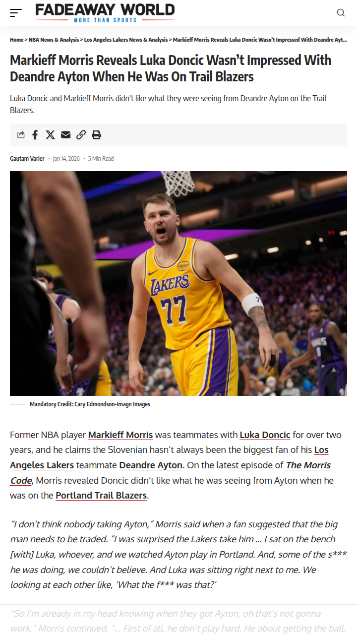 Oscar Gonzalez+FollowLuka & Ayton: Can the Lakers Make It Work?So Markieff Morris just dropped a nugget on The Morris Code: King Luka wasn’t exactly sold on Deandre Ayton back when he was with the Blazers. Morris said he and Luka would watch Ayton and just shake their heads at his effort. Fast forward, and now Ayton’s a Laker—on a bargain deal, but still a gamble. He’s got flashes of dominance, but consistency is the real question. Are the Lakers rolling the dice too hard here? #Sports #Basketball #Lakers00Share