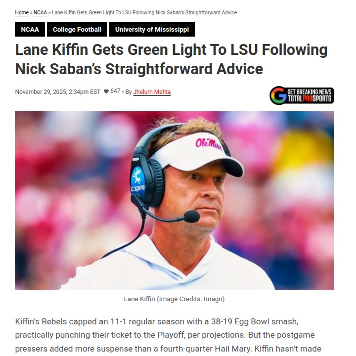 Christopher Hughes+FollowKiffin’s Next Play: LSU or Stay Rebel?The Lane Train is at a crossroads! After leading the Rebels to an 11-1 season and Egg Bowl glory, Lane Kiffin’s next move is the talk of the SEC. With Florida out and LSU fans buzzing, even the GOAT Nick Saban weighed in, hinting that recruiting power could tip Kiffin’s decision. Is he Baton Rouge-bound, or does he keep rolling in Oxford? We’ll know. Thoughts on Saban’s influence here? #Sports #Football #LaneKiffin02Share