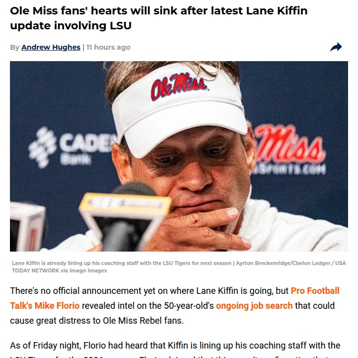 glen25+FollowLane Kiffin’s LSU move shakes up Ole MissLane Kiffin is reportedly assembling a coaching staff for LSU, and that’s got Ole Miss fans on edge. While nothing’s official, the buzz is strong enough that folks in Oxford are bracing for a major shakeup. If Kiffin does jump ship, it’s not just about losing a coach—it’s about the future of a program he helped rebuild. Meanwhile, Auburn and Florida are circling Tulane’s Jon Sumrall as their next big hire. What do you think: Is Kiffin making the right move, or should he stick with the Rebels? #Sports #Football #LaneKiffin00Share