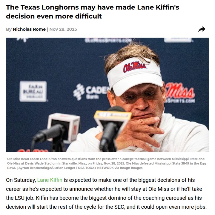 Michael Pitts+FollowLonghorns Shake Up Lane Kiffin’s DilemmaWow, the Texas Longhorns just made Lane Kiffin’s decision way tougher! With the Aggies falling to Texas, the door’s now open for the Rebels to make the SEC Championship—if Bama slips in the Iron Bowl. Hotty Toddy fans, would it be a bad look for the Lane Train to leave Ole Miss on the brink of the Playoff? This coaching carousel just got wild! #Sports #Football #LaneKiffin00Share