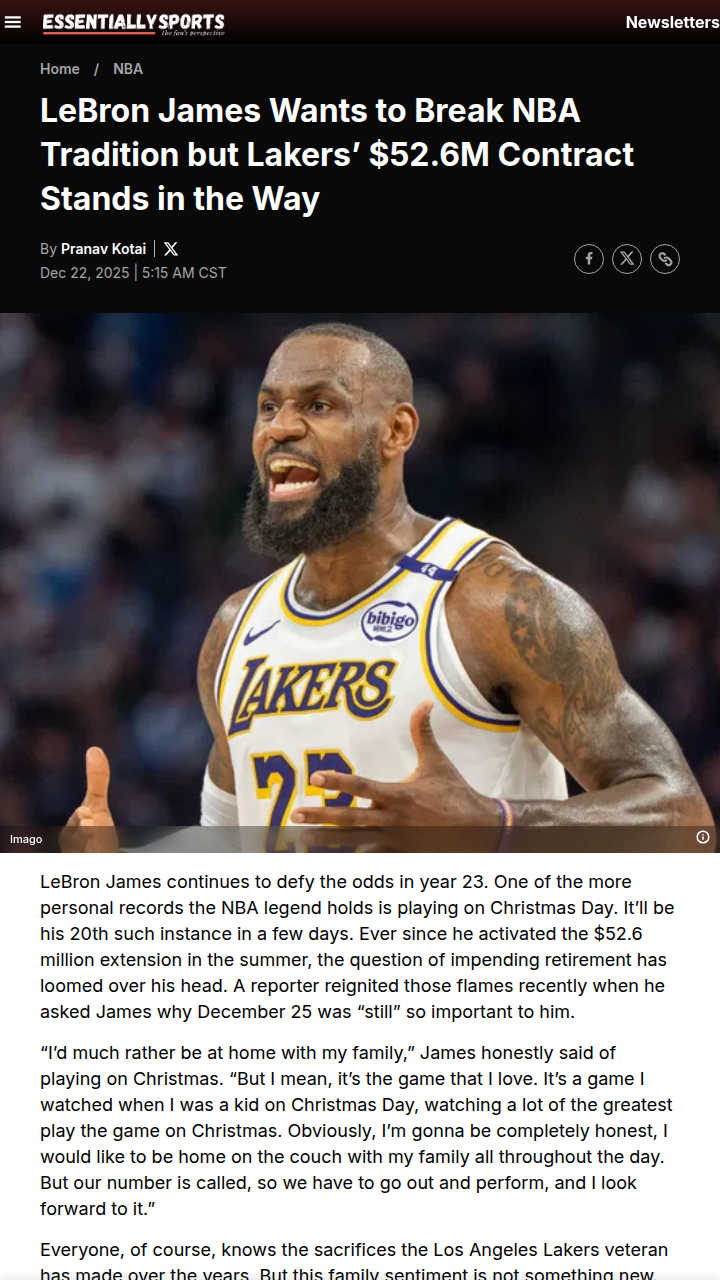 summersivan+FollowKing James vs KD: Christmas Rivalry ReturnsIt’s almost Christmas, and you know what that means—LeBron’s back on the big stage! King James is set for his 20th Christmas Day game, but this year there’s extra drama. Despite his $52.6M Lakers contract, LeBron admits he’d rather be home with family. Still, he’s lacing up for a must-watch showdown with his old rival, KD. Their first holiday clash since 2018 is sure to light up the ratings. Who’s ready for another chapter in this epic rivalry? #Sports #Basketball #LeBronJames00Share