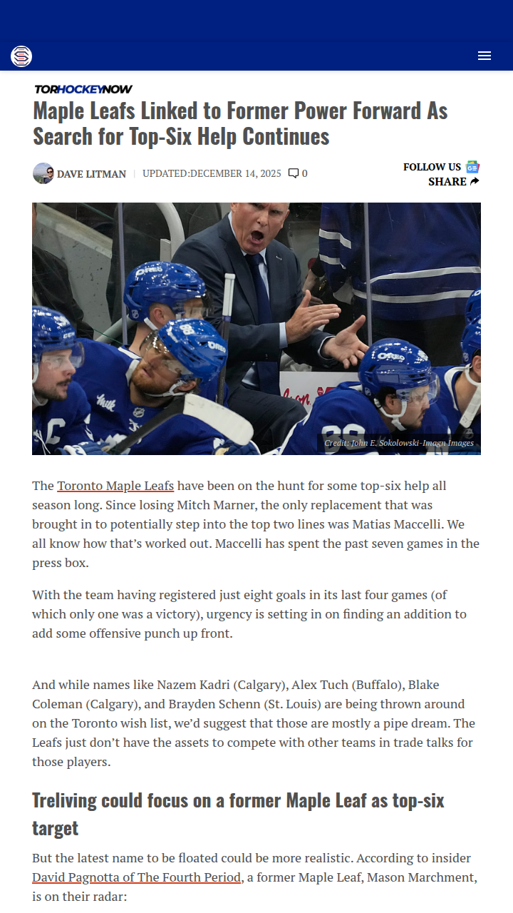 Jason Dawson+FollowShould the Leafs Bring Back Marchment?With the Buds struggling to score and Matias Maccelli stuck in the press box, the search for a top-six boost is heating up. While big names like Kadri and Tuch seem out of reach, insider chatter has Mason Marchment—once a Marlie and now a Kraken—back on Toronto’s radar. Marchment’s physical edge and playoff grit could be just what Coach Berube needs. Is it time for Treliving to finally reel in the one that got away? #Sports #IceHockey #LeafsNation00Share