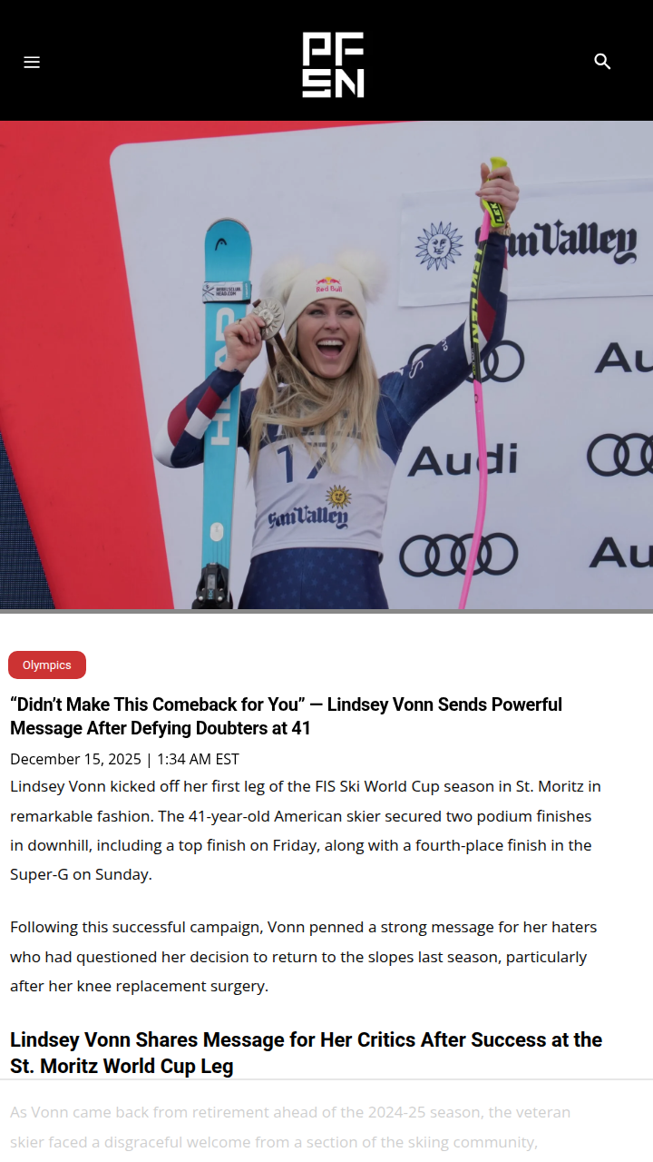 jharvey+FollowVonn Shuts Down Haters in St. MoritzQueen Lindsey is back! After knee surgery and all the doubters, Vonn stormed St. Moritz with two podiums in the downhill and a near-podium in Super-G. Even with legends like Zurbriggen and Dorfmeister questioning her comeback, Vonn made it clear—she’s racing for herself, not the critics. Her message? The haters just fuel her fire. With Milan-Cortina on the horizon, can Vonn add another chapter to her legendary career? #Sports #LindseyVonn #SkiWorldCup00Share
