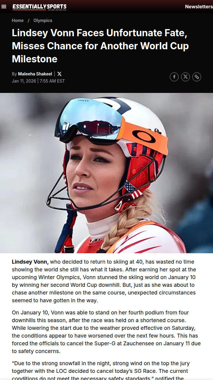 andersonkaren+FollowVonn’s World Cup Milestone Slips AwayTough break for the Speed Queen! Lindsey Vonn looked set to chase her 85th World Cup win after a dominant downhill at Zauchensee, but Mother Nature had other plans. Heavy snow and wind forced officials to cancel the Super-G, denying Vonn another shot at history. With only two Super-Gs left before Milano-Cortina, every race is now crucial. Do you think Vonn can still make it to 85 before her 2026 retirement? Let’s hear your takes! #Sports #LindseyVonn #WorldCup103Share