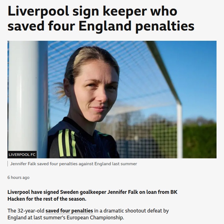 Tara Moran+FollowFalk Joins Reds After England Penalty HeroicsBig news for the Reds! Liverpool have landed Swedish shot-stopper Jennifer Falk on loan from BK Häcken. Falk made headlines last summer after saving four penalties against the Lionesses in a dramatic Euro shootout. With her reputation as a penalty killer, could she be the game-changer Liverpool need in tight WSL clashes? Excited to see how Falk and Bergström settle in! Thoughts on this move, Kopites? #Sports #Soccer #LiverpoolFC00Share