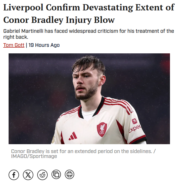 Maurice Miller+FollowBradley Injury Mars Arsenal-Liverpool ClashTough break for the Reds as Conor Bradley is now sidelined for the season after that late collision with Martinelli during the Arsenal stalemate. The incident’s got fans buzzing—was Martinelli out of line trying to hustle Bradley off the pitch, or just caught up in the moment? Slot isn’t blaming the Arsenal winger, but this is a huge setback for Liverpool’s backline. How do you see the rivalry shaping up with Bradley out? #Sports #Soccer #LiverpoolFC00Share