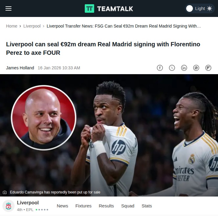 Maurice Miller+FollowMadrid Shake-Up: Camavinga to Anfield?Big news out of Madrid—Florentino Perez is reportedly ready to offload four stars, including the electric Eduardo Camavinga and Vini Jr., after sacking Xabi Alonso post-El Clásico defeat. With Los Blancos in flux, the Reds could finally land their long-term midfield target. Insider talk says Liverpool are keeping tabs, but with Camavinga tied down until 2029, it’ll take a massive bid. Would you break the bank for him, or look elsewhere? #Sports #Soccer #LiverpoolFC00Share