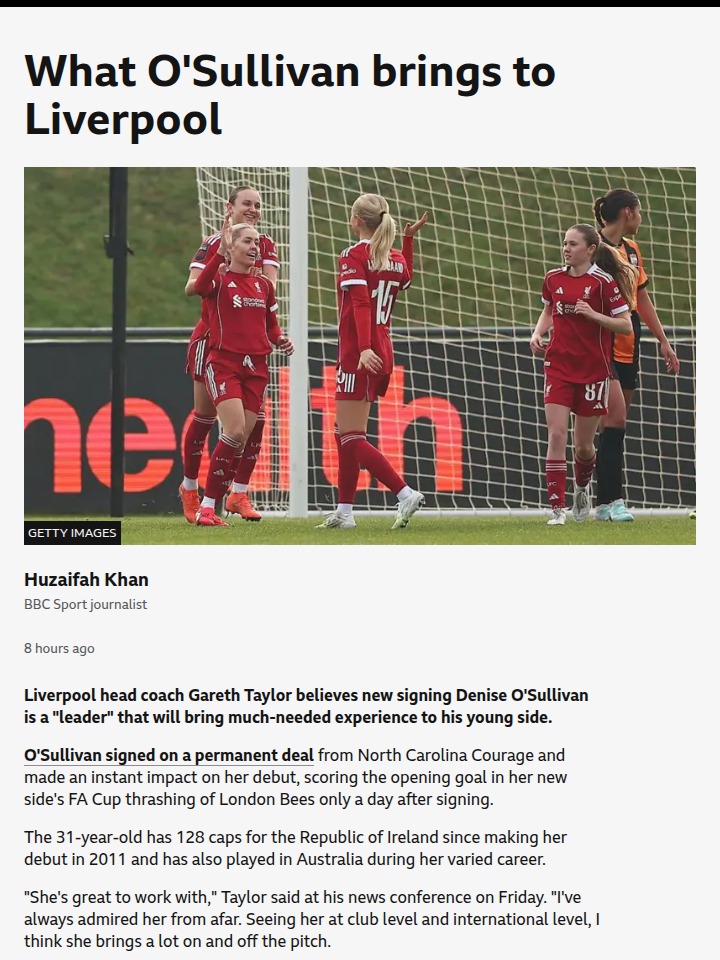kochcandice+FollowO'Sullivan's Instant Impact at LiverpoolWhat a debut for Denise O'Sullivan! The Irish skipper showed why she's called a leader, scoring right away and bringing serious experience to a young Liverpool squad. With her 128 caps and global club history, she’s set to be a game-changer alongside vets like Gemma Bonner. Reds fans, do you think O'Sullivan is the missing piece for a WSL turnaround? #Sports #Soccer #LiverpoolFC00Share