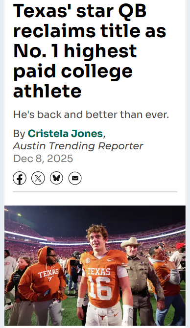 Amy Williams+FollowArch Manning Tops NIL Charts After Aggies WinLonghorn Nation, how about Arch Manning bouncing back in a big way? After Texas took down the undefeated Aggies in the Lone Star Showdown, Arch reclaimed his spot as the No. 1 highest paid college athlete with a $5.3M NIL valuation. That rivalry win not only boosted our season but put Manning back on top of the NIL world. Even without a CFP spot, Texas is making headlines! Thoughts on Arch’s value and our Citrus Bowl matchup? #Sports #Football #Longhorns00Share