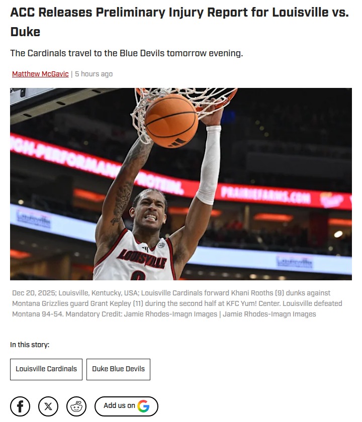 Patrick Gonzales+FollowLouisville faces Duke tonight after wild travel delaysWinter Storm Fern threw a wrench in Louisville’s plans, forcing the Cardinals to travel to Durham just hours before their big rematch against No. 4 Duke. After finally getting star guard Mikel Brown Jr. back from injury, Louisville now faces the Blue Devils’ home-court advantage and a seven-game Duke win streak. Tonight’s tip-off is at 7 p.m. on ESPN, and the Cards are 6.5-point underdogs. With all this chaos, do you think Louisville can pull off an upset, or will Duke’s momentum prove too much? Let’s hear your predictions! #Sports #Basketball #LouisvilleBasketball00Share