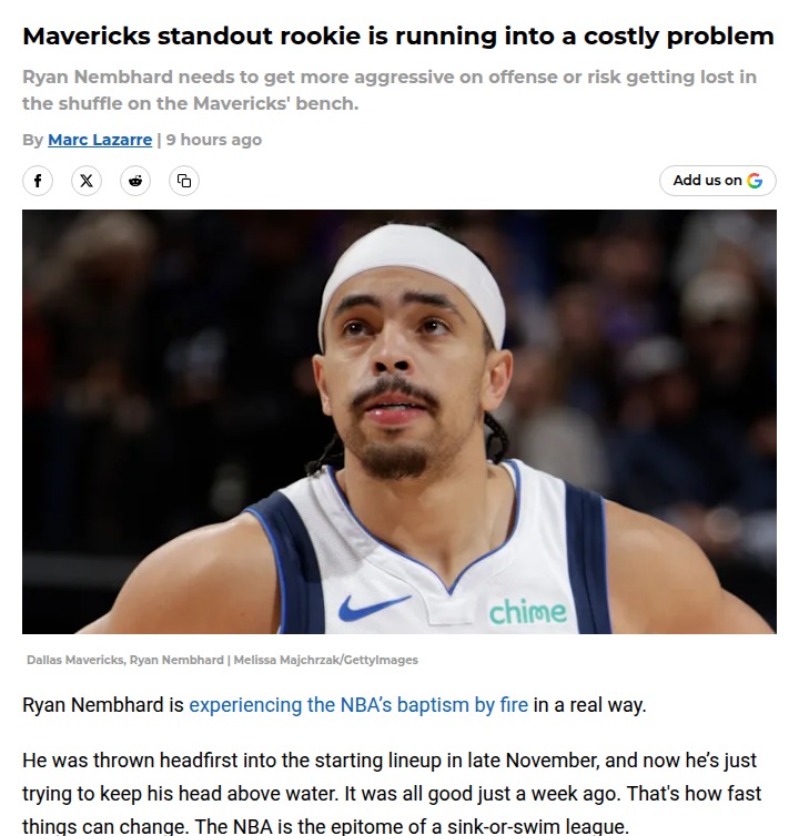 Susan Reeves+FollowCan Nembhard Step Up for the Mavs?Mavs fans, is Ryan Nembhard losing his grip on the starting PG spot? After a promising start, Nembhard’s offensive aggression has faded, just as Dallas hit a rough patch. With Cooper Flagg lighting it up and Brandon Williams thriving off the bench, Coach Kidd is rewarding whoever brings the heat. The team’s chemistry looked solid before Davis’ injury, but now Nembhard needs to rediscover his scoring touch to keep the Mavs in the playoff hunt. What’s your take—should he shoot more or keep feeding the hot hands? #Sports #Basketball #MFFL00Share