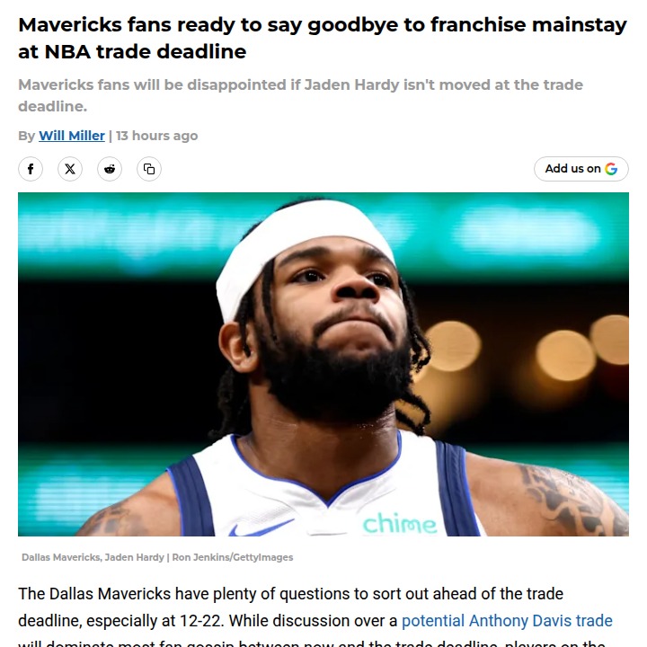 Ryan Lopez+FollowDallas Mavericks fans call for Hardy tradeJaden Hardy’s time in Dallas might be running out, and fans aren’t shy about it. Despite signing a three-year deal, Hardy hasn’t shown the leap many hoped for, especially with younger guards like Nembhard and Williams outplaying him. With the trade deadline looming and the Mavericks needing flexibility to build around stars like Cooper Flagg, the community is buzzing about moving on from Hardy to make room for real solutions. What do you think—should Dallas cut ties now, or does Hardy deserve one more shot to prove himself? #Sports #Basketball #MFFL00Share