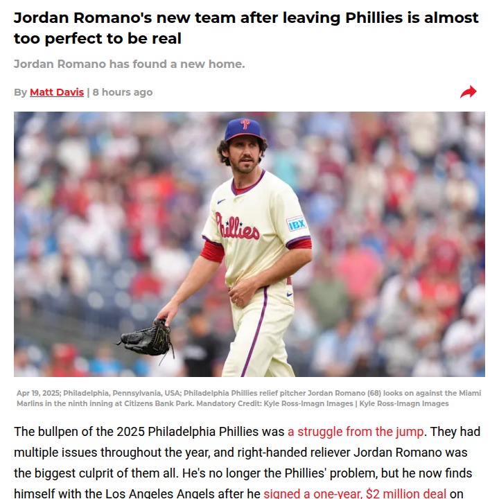 terrysharon+FollowRomano’s Redemption? Angels Take a GambleTalk about a wild turn—Jordan Romano, once a two-time All-Star, had a nightmare stint with the Phillies in 2025, posting an 8.23 ERA and blowing key saves. Now, he’s landed with the Angels, a team notorious for picking up struggling arms. Is this the perfect match of misfortune, or can Romano find his groove in LA’s bullpen? With the Halos’ playoff drought, this move is either genius or more of the same. Thoughts on this fit? #Sports #Baseball #MLB00Share