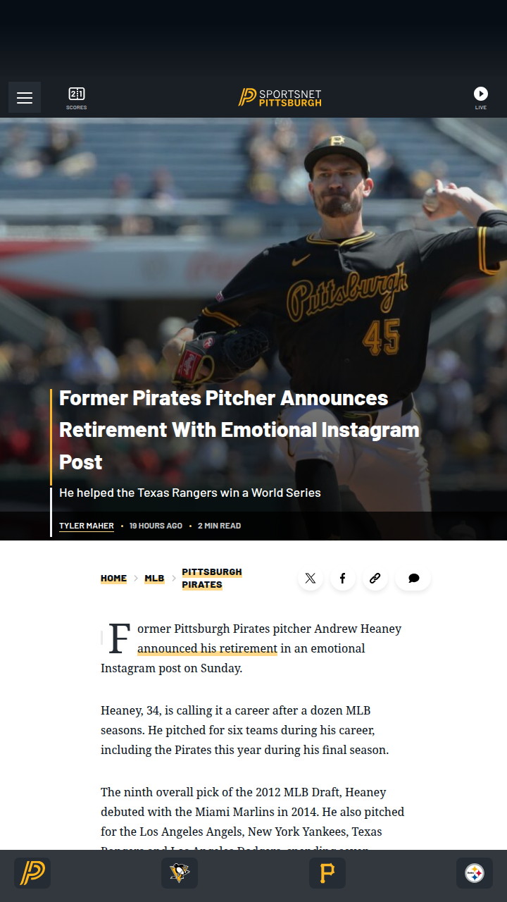 Jacob Morris+FollowAndrew Heaney’s heartfelt goodbye to baseballAndrew Heaney’s retirement announcement hits home for Pirates fans—after a dozen seasons, the lefty is stepping away from the mound. Even though his year in Pittsburgh didn’t go as planned, Heaney’s leadership and willingness to help younger pitchers made a real impact in the clubhouse. He leaves the game as a World Series champ with the Rangers and a reputation for being a great teammate everywhere he played. Now, he’s focusing on family and giving back to the community. What’s your favorite memory of Heaney’s time in the MLB? #Sports #Pirates #MLB00Share