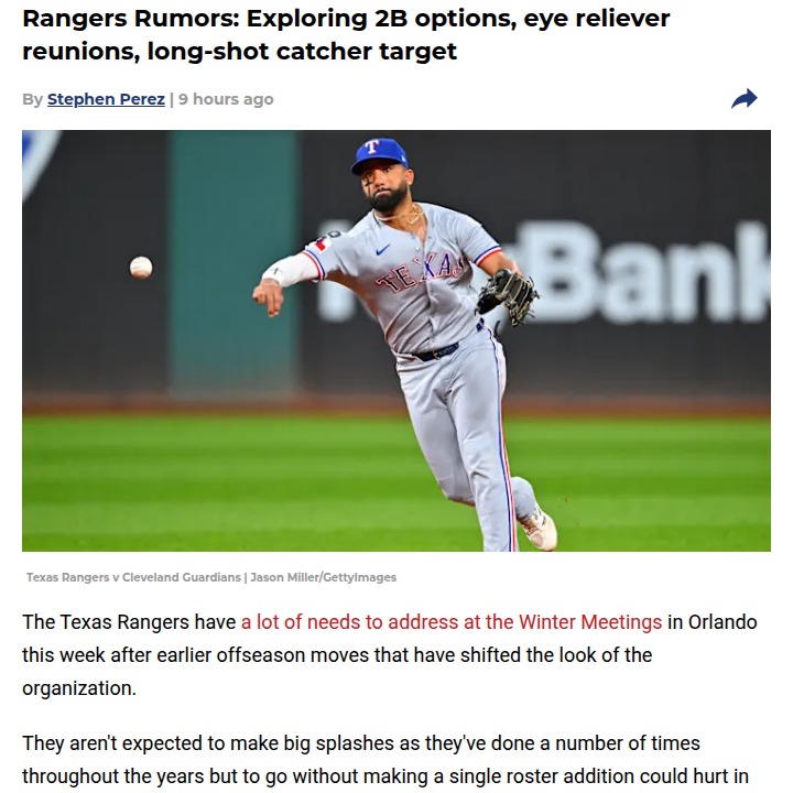jharvey+FollowTexas Rangers face tough choices this offseasonBig changes could be coming for the Texas Rangers, and not all of them are flashy. The team’s payroll limits are making it tough to chase top free agents, especially at catcher, with J.T. Realmuto likely out of reach. Instead, the Rangers are looking at more affordable options and hoping one of their own steps up at second base after Marcus Semien’s departure. There’s also talk of bringing back familiar bullpen arms, but negotiations could get tricky. What do you think—should the Rangers focus on developing their young talent or push for a big signing despite the cost? #Sports #TexasRangers #MLB00Share