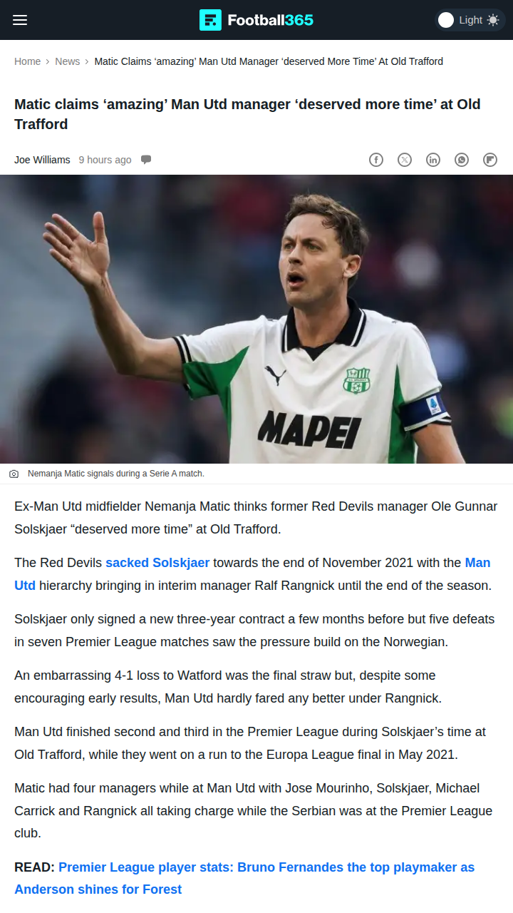 Jamie Mack+FollowDid Ole Deserve More Time at United?Nemanja Matic has stirred the pot by saying Ole Gunnar Solskjaer, aka the Baby-faced Assassin, deserved a longer run at the helm of the Red Devils. Despite a rough patch that led to his sacking, Matic points out Ole took United to second and third in the league and built a positive atmosphere. Was the Watford loss really the final straw, or did the board pull the trigger too soon? #Sports #Soccer #MUFC00Share