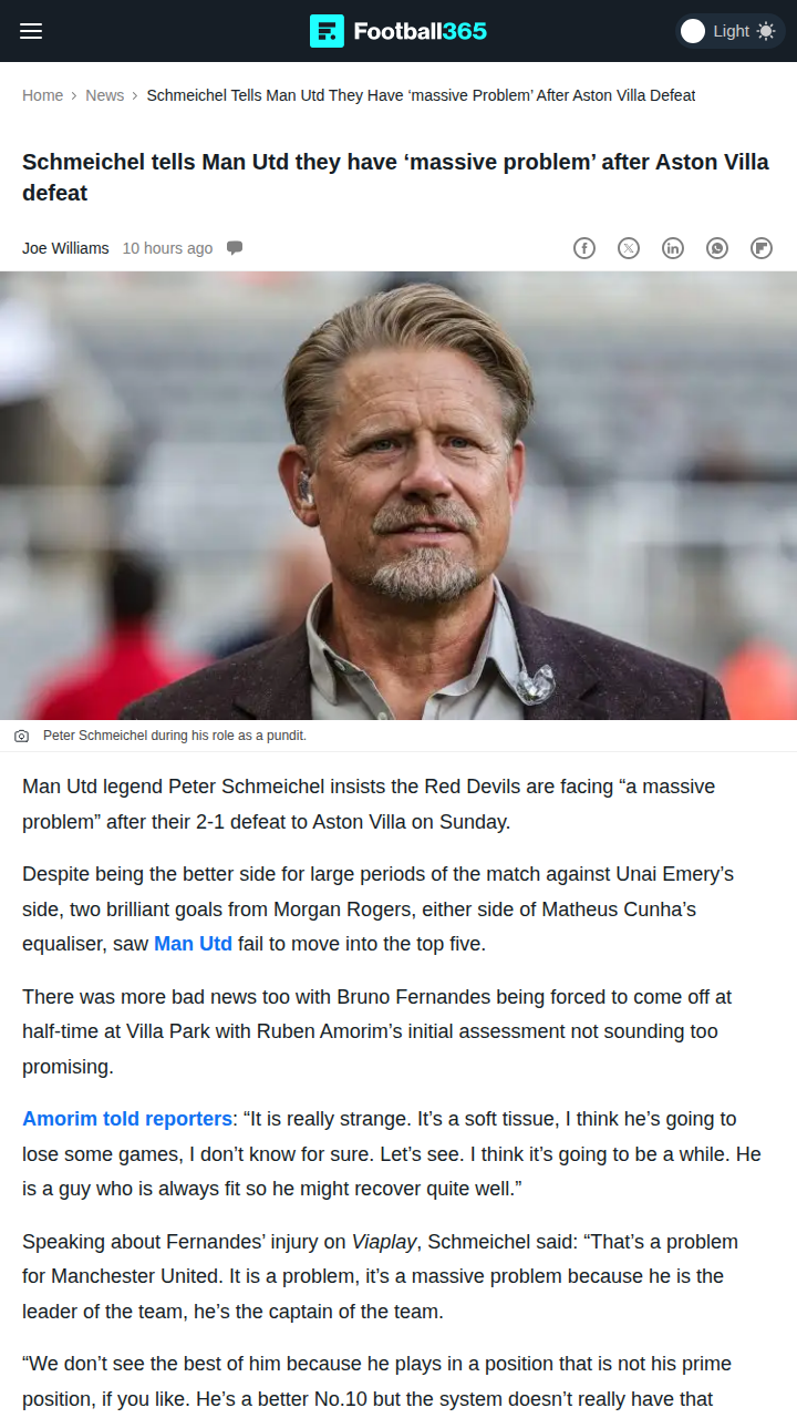 Charles Mills+FollowRed Devils’ Captain Crisis After Villa LossTough day for the Red Devils faithful. After the 2-1 defeat to Villa, club legend Big Pete Schmeichel is sounding the alarm—losing Bruno, our captain and engine, is a massive blow. With Bruno out and the defense looking shaky (Keano wasn’t impressed with Dalot and Yoro), United’s top-five hopes are slipping. Can we bounce back before Newcastle comes to town? #Sports #Soccer #MUFC00Share