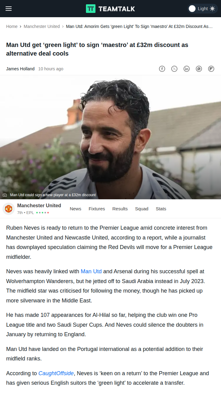 rogerschristine+FollowRed Devils Eye Maestro Neves at Bargain PriceLooks like the Red Devils are making serious moves for Ruben Neves, who’s reportedly given the green light for a Premier League return! With his contract winding down at Al-Hilal, United could snag the Portuguese maestro for just £15m—a massive discount from his original fee. This could be a game-changer in the midfield battle, especially with Newcastle also in the hunt. Is Neves the missing piece for United’s European push? #Sports #Soccer #MUFC00Share