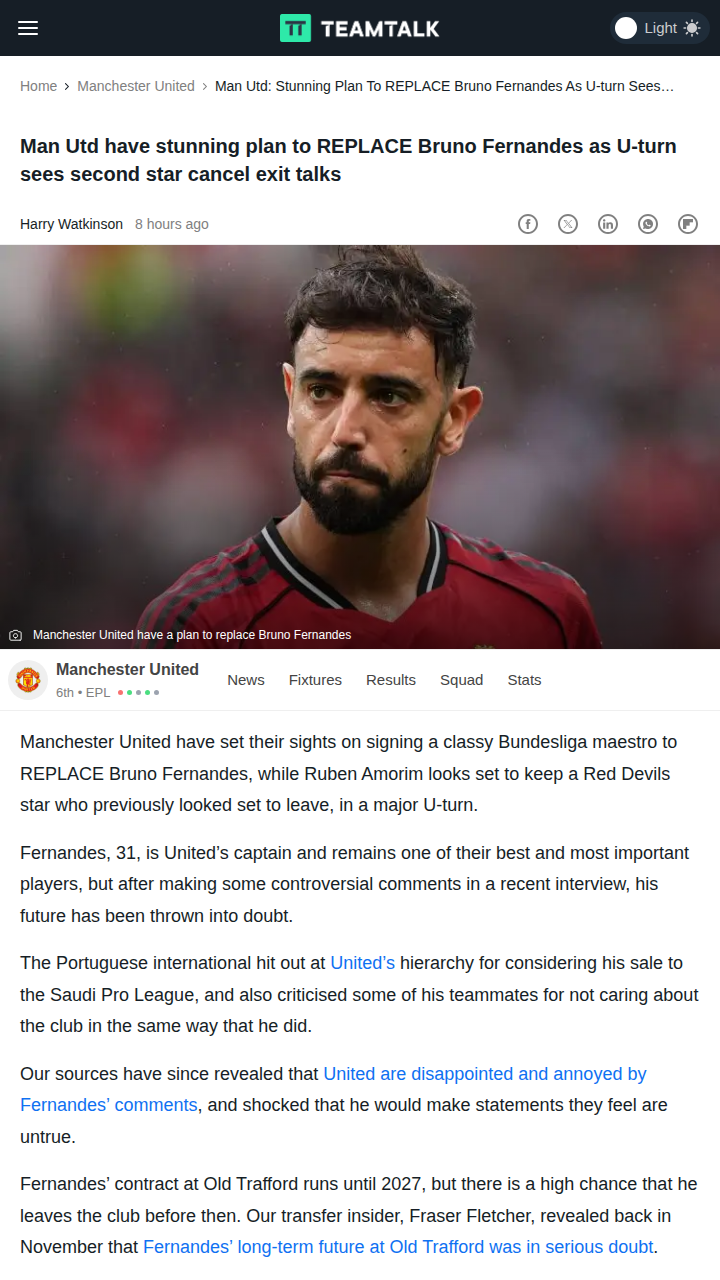 kochcandice+FollowBruno’s Future in Doubt—Stuttgart Star EyedRed Devils fans, what do you make of this Bruno Fernandes saga? After Captain Fantastic’s blunt interview, the club’s reportedly lining up Stuttgart’s Angelo Stiller as a possible replacement. Meanwhile, Casemiro—once written off—could be sticking around after a contract U-turn. Is this the end of the Bruno era at Old Trafford, or just more transfer drama? Let’s hear your takes on who should lead United’s midfield next season! #Sports #Soccer #MUFC00Share
