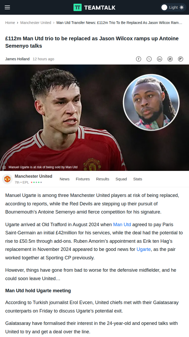 Jamie Mack+FollowRed Devils Eye Semenyo as Ugarte Faces ExitBig shake-up brewing at Old Trafford! Looks like Manuel Ugarte’s time as the Red Devils’ midfield anchor could be cut short, with INEOS ready to cash in and bring in fresh legs. Rumor has it, Jason Wilcox is ramping up talks for Bournemouth’s Antoine Semenyo, hoping to beat out Liverpool and City. Could this be the move that reignites United’s rivalry with the league’s elite? #Sports #Soccer #MUFC00Share