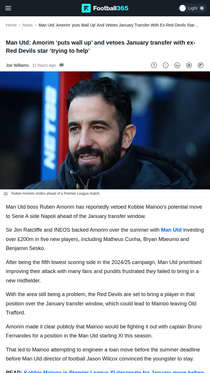 Tara Moran+FollowAmorim Blocks Mainoo’s Napoli MoveRed Devils fans, what do you make of Ruben Amorim’s decision to slam the door on Kobbie Mainoo’s rumored loan to Napoli? With United’s midfield still a weak spot and Mainoo barely seeing the pitch, some say Amorim’s playing it safe, while others think he’s missing a chance to let the youngster shine before the World Cup. Even ex-Red Scott McTominay tried to help broker the deal! Is Amorim right to hold firm, or should Mainoo get his shot in Serie A? #Sports #Soccer #MUFC00Share