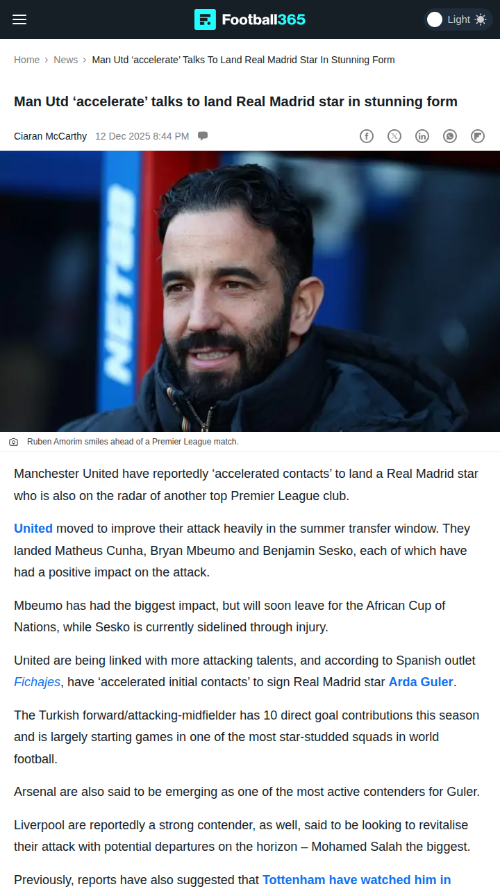 Jillian Morse+FollowRed Devils Eye Real Madrid’s Wonderkid GulerLooks like the Red Devils are making serious moves for Real Madrid’s rising star, Arda Guler. With Mbeumo heading to AFCON and Sesko out injured, United’s attack needs fresh firepower. Guler’s been on fire this season with 10 direct goal contributions, but prying him from Los Blancos won’t be easy—especially with Arsenal and Liverpool also circling. Do you think United can pull off this blockbuster, or will Real hold on to their Turkish gem? #Sports #Soccer #MUFC00Share
