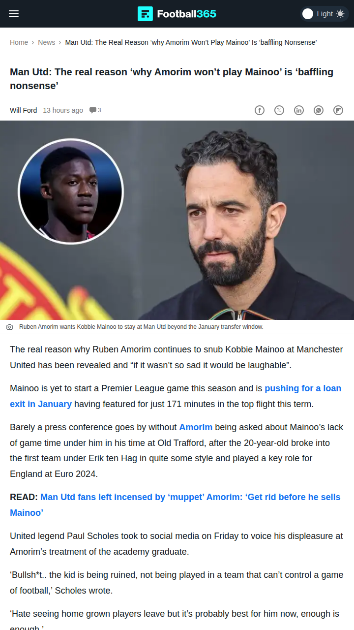 Jillian Morse+FollowMainoo Snub Sparks Man Utd Fan FuryRed Devils fans, what’s going on with Amorim and our homegrown star, Mainoo? After shining for England at Euro 2024 and breaking through under Ten Hag, Mainoo can’t get a Premier League start under Amorim—who claims he’s not mobile enough. Even United legend Scholes is calling this out as nonsense. With rumors of a January loan exit, are we really about to lose another academy gem? Is Amorim missing a trick or just sticking to his guns? #Sports #Soccer #MUFC00Share