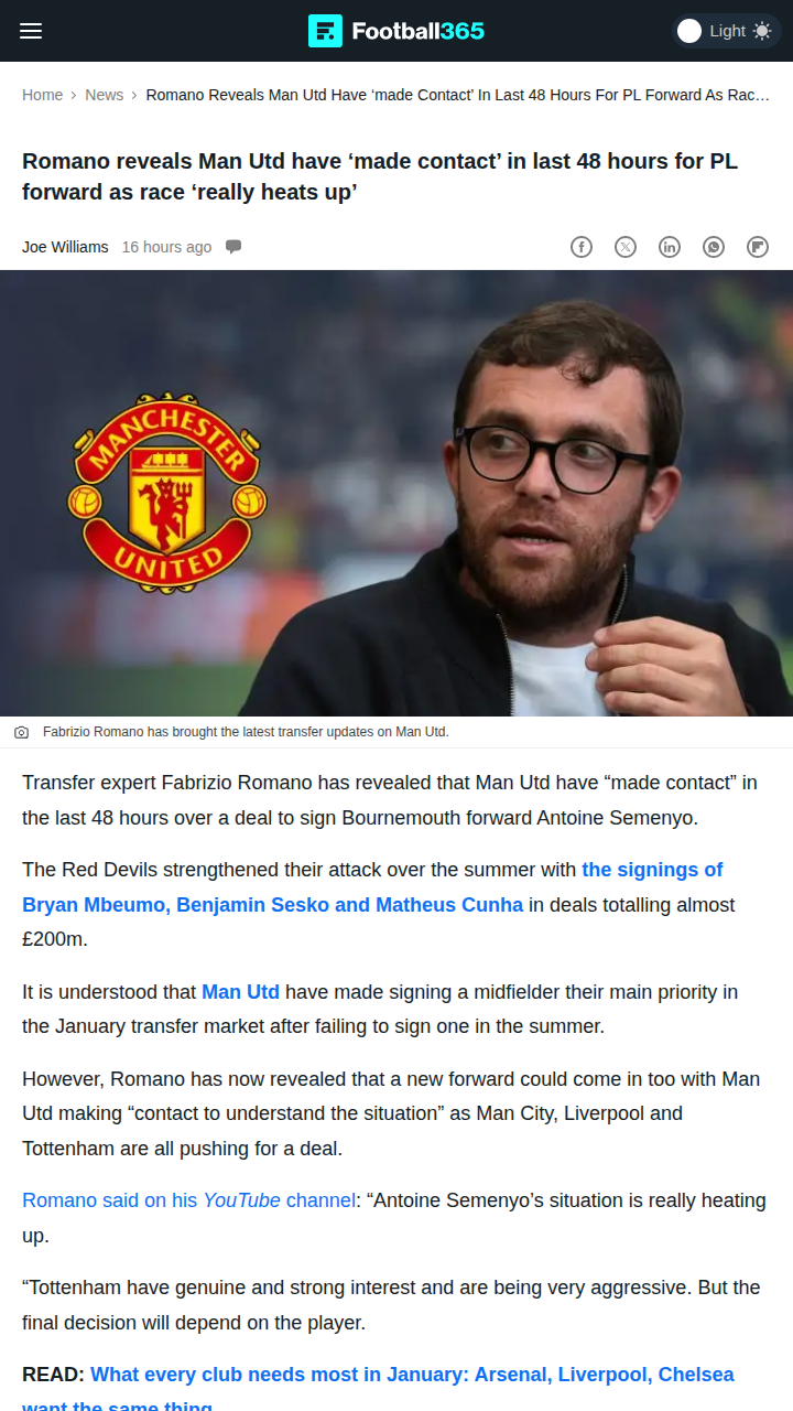 kochcandice+FollowRed Devils Join Semenyo Transfer BattleInsider scoop: The Red Devils have officially entered the race for Bournemouth’s Antoine Semenyo, with King Eric’s old rivals City, Liverpool, and Spurs also circling. Romano says United made contact in the last 48 hours, signaling a real tug-of-war for the forward. With Tottenham pushing hard and Liverpool weighing their options, it’s all eyes on Semenyo’s decision. Meanwhile, young Mainoo could be heading out on loan for more minutes. Thoughts on who wins this transfer showdown? #Sports #Soccer #MUFC00Share